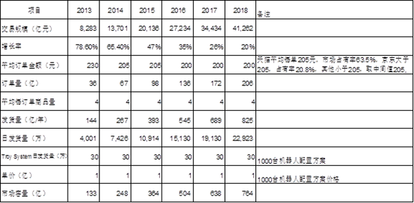 電商AGV 歐標智能自主研發的物流分揀AGV,該產品用于物流、快遞公司大型倉庫的快件分揀環節。根據易觀智庫《中國互聯網產業2015趨勢盤點·2016發展預測》的數據,我們對國內電商市場容量進行了以下統計及估算: